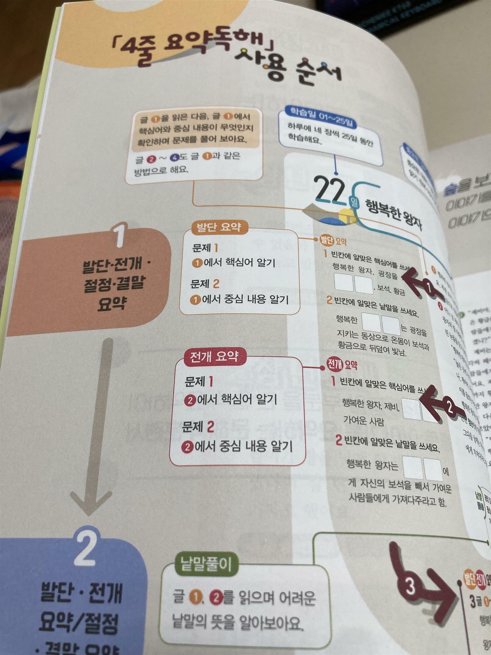 이젠교육 [4줄 요약독해]는 '하나의 이야기를 발단,전개,절정,결말 네 부분으로 나누고 각 부분을 한 줄씩 요약하여 전체 이야기를 네 줄로 요약해보는 문해력 훈련서'랍니다.