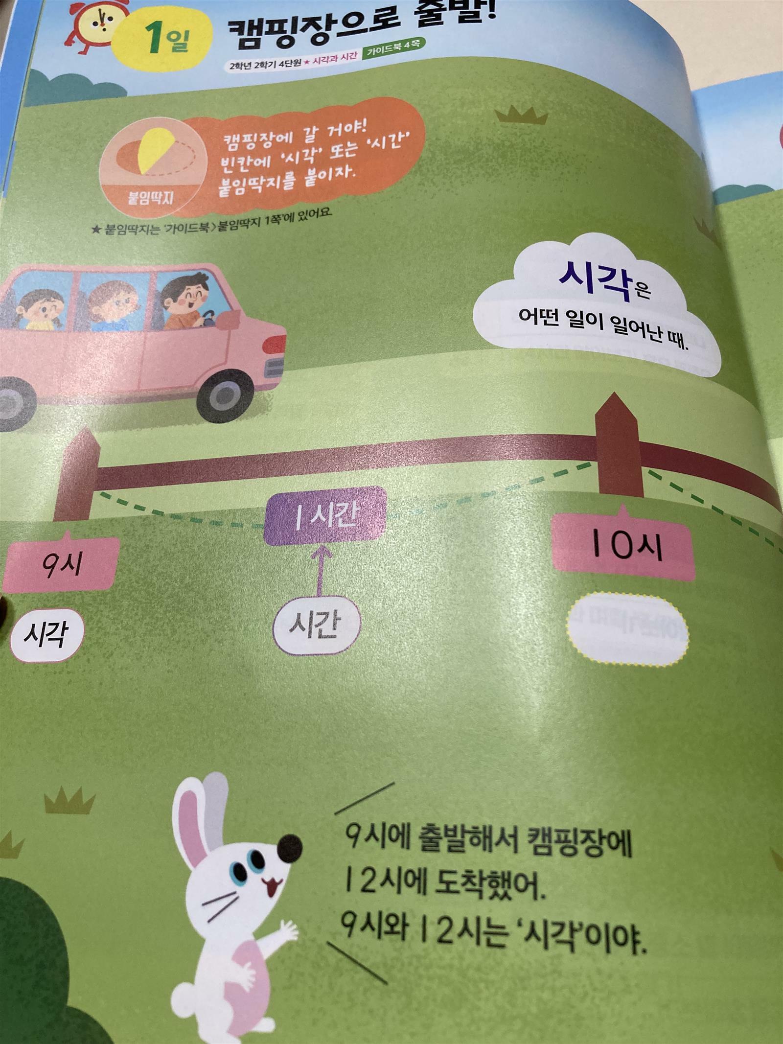 시각과 시간을 구분하는 문제를 붙임딱지를 붙이며 풀어보면서 두 개념의 차이를 느껴보고요.