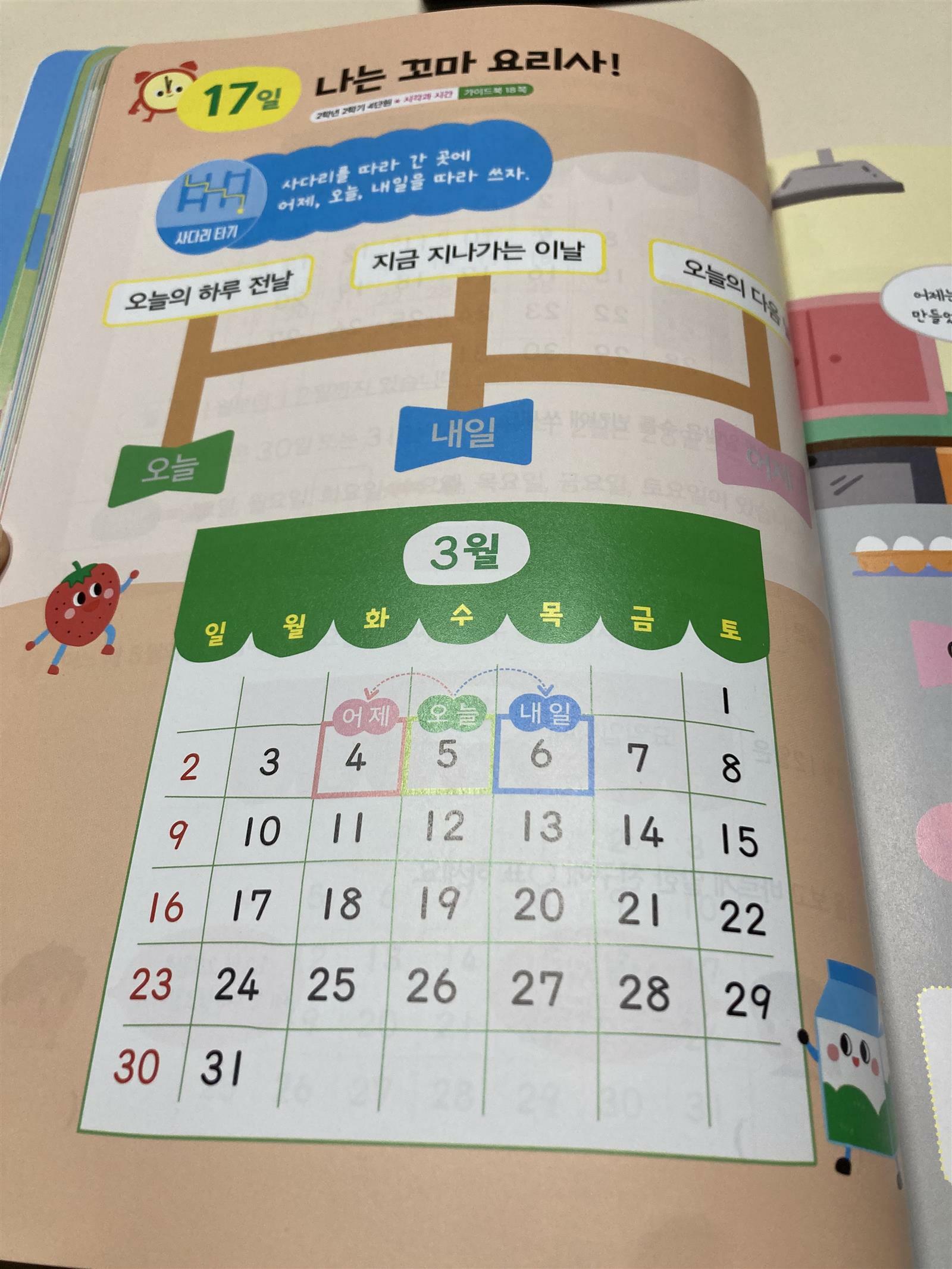 어제, 오늘, 내일의 개념도 달력을 활용하여 재미있는 일러스트와 붙임딱지로 학습할 수 있네요.