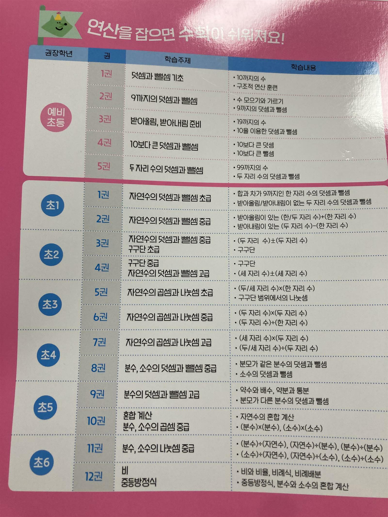 그 중에서 예비초등 단계는 초1대비를 위한 전반적인 연산 개념을 5권을 나누어 학습할 수 있습니다.