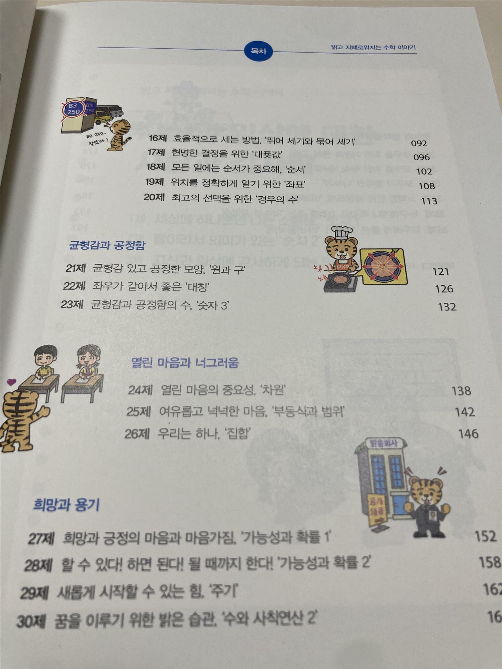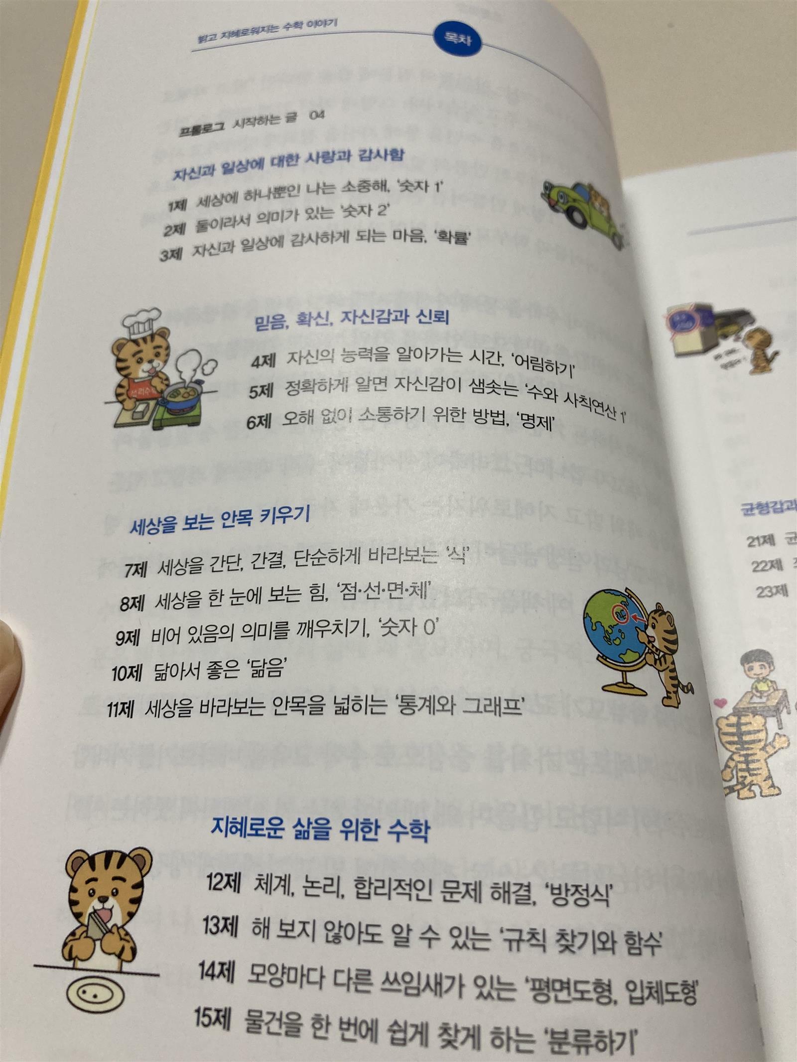 목차에서는 다양한 수학 용어들과 자기계발서에 나올 법한 단어들이 조화롭게 섞여있습니다.