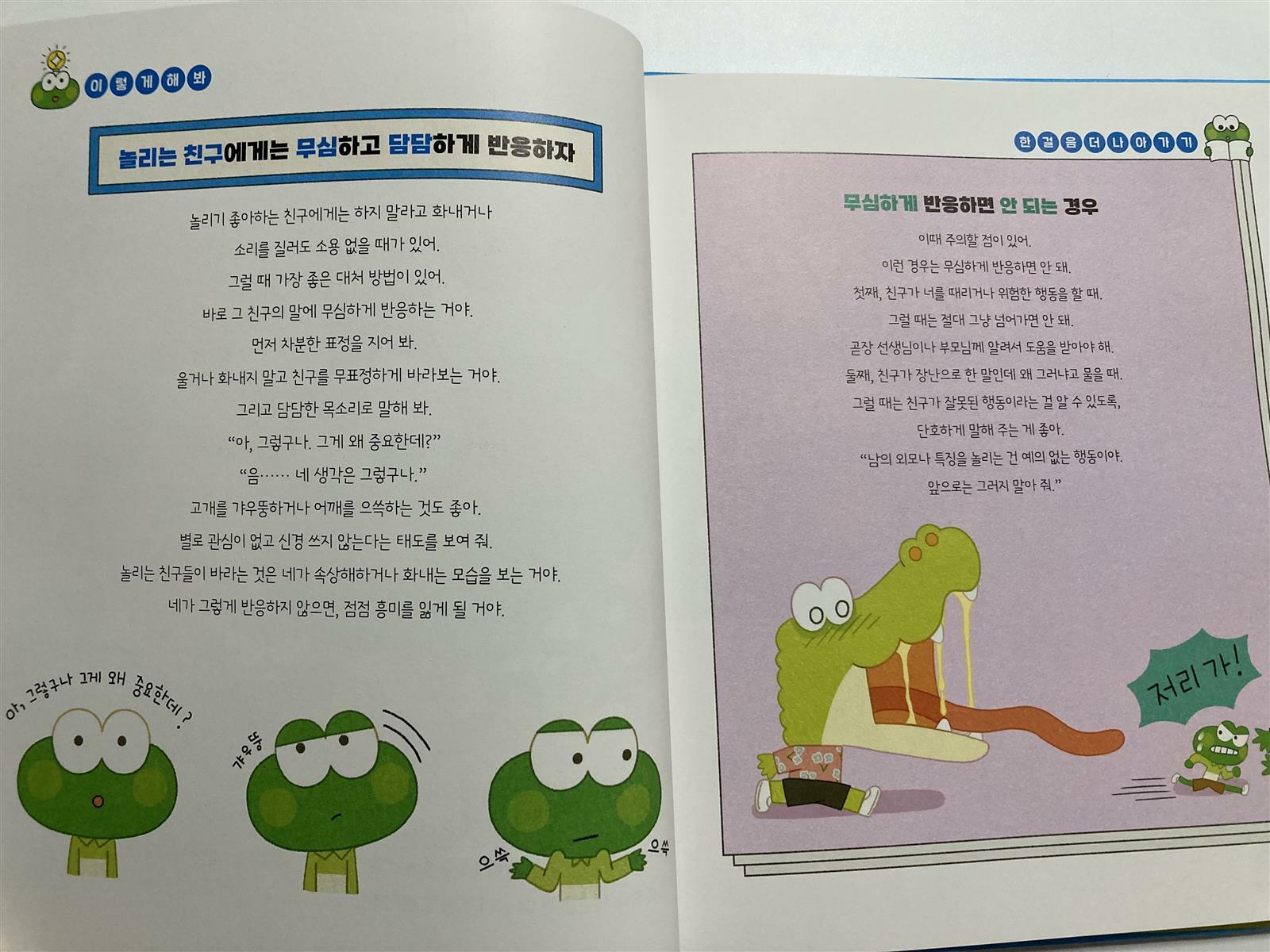 친구가 놀릴 때 반응을 보이지 않고 무시하라고 방법을 제시해 줍니다.