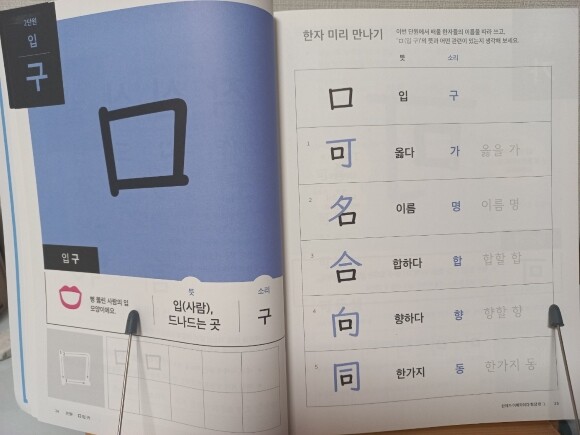 12단원으로 매 주 5개씩 12주를 익혀서 60개의 한자를 익히는데, 매 주 기본 한자를 중심으로 5개 한자가 파생이 되네요. 예를 들어서 2주차 입 구(口) 한자를 기준으로 해서, 옮을 가(可), 이름 명(名), 합할 합(合), 향할 향(向), 한가지 동(同) 5개 한자를 2주차에 익히게 되네요!
