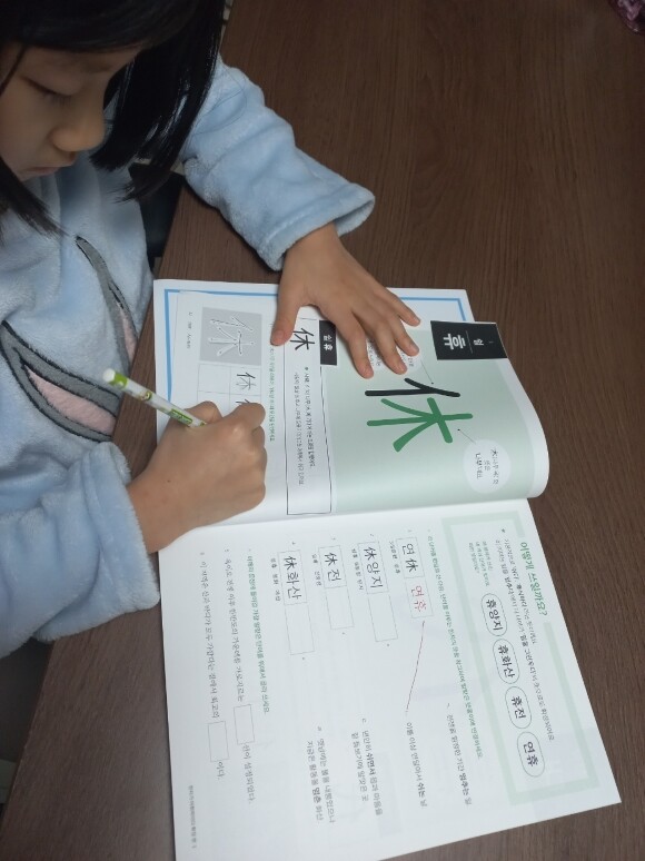 꼬마아가씨는 '사람이 서 있는 모습'의 한자 사람 인(人)을 공동 한자로 익힌 후에 쉴 휴(休), 대신할 대(代), 살 주(主), 지을 작(作), 믿을 신(信) 5개의 개별한자를 익혀려고 하네요^^ 오늘은 쉴 휴(休)이네요~
