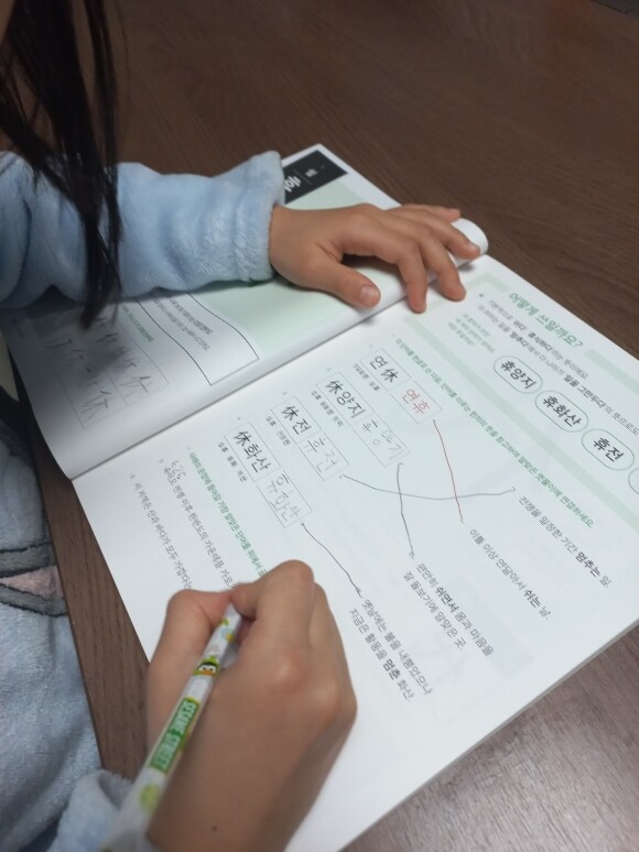 쉴 휴(休)는 사람(人)이 나무(木)에 기대어 쉬는 모양을 합했다는 설명을 듣고서 직접 써 보기도 하고, '쉬다', '휴식하다'라는 뜻을 기본으로 하여 '멈추다'와 '일을 그만두다'라는 뜻으로도 확장되는 것을 깨달으며, 그와 관련한 '휴양지, 휴화산, 휴전, 연휴'라는 단어들을 익히네요!
