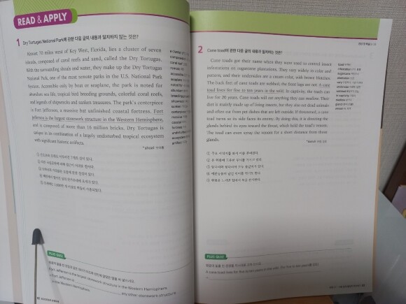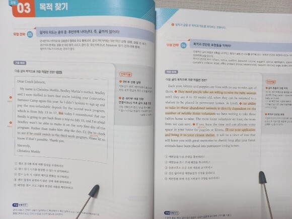 대수능, 평가원 모의고사, 전국연합 학력평가 등에 출제된 문제를 통해서 학습한 유형 전략이 어떻게 적용되는지 확인할수가 있고, 독해유형마다 적용 예제를 제공하여, 해당 유형 전략을 실제로 지문을 활용하여 독해 연습을 할 수 있게 되어 있네요!