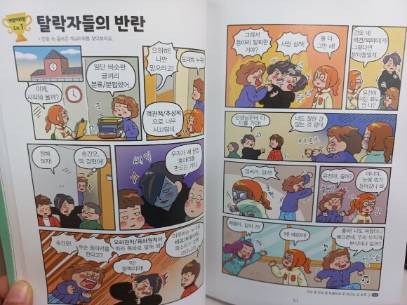 어휘 100가지를 익힐 수 있는데, '3단계 어휘 공부'이네요! 1단계는 주고 받는 카톡 속에서 쓰인 개념어휘를 찾아볼 수 있고, 2단계는 '똑똑 개념어휘' 코너에서 개념어휘의 뜻과 예문을 통해서 익힐 수 있으며, 3단계는 재미있는 만화로 어휘를 정검할 수가 있네요^^