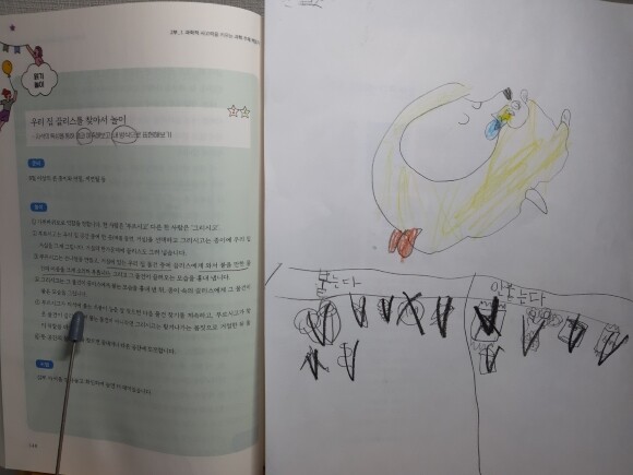 언제 했는지 ㅋㅋ 꼬마 아가씨가 색연필로 이리저리 흉내내면서 줄 그어 넣은 것을 지었는데도 ㅋ 책 속 사진이 저리 까맣네요~