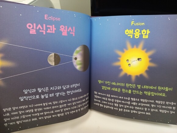 《우주의 ABC》는 A(Asteroid 소행성), B(Binary star 쌍성), C(Comet 혜성), D(Dark matter 암흑 물질), E(Eclipse 일식과 월식), F(Fusion 핵융합),G(Galaxies 은하), H(Habitable zone 생명가능지대) 등등..의 다양한 천문학 과학 용어들을 만나볼 수가 있어요. 일단 그림들이 큼지막하고 아이의 호기심을 자극하기에 충분해서 천문학에 관한 용어를 알아가는 첫 발자국 도서로 유용하네요!