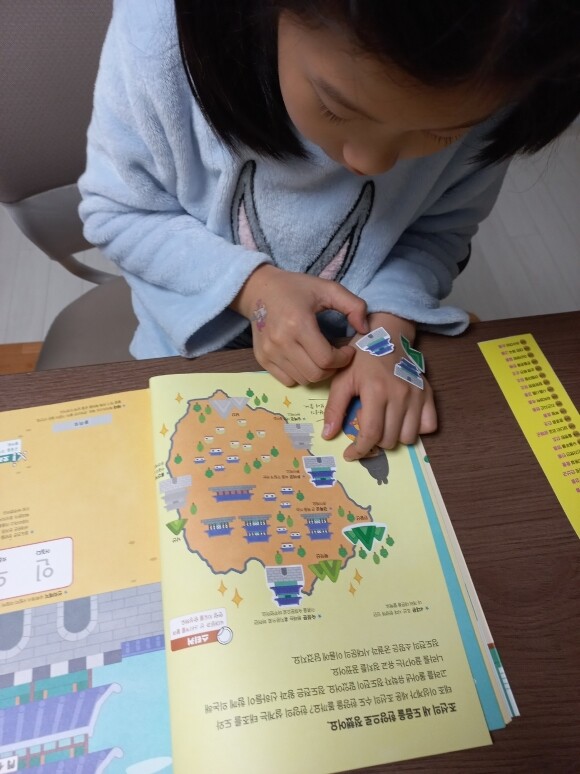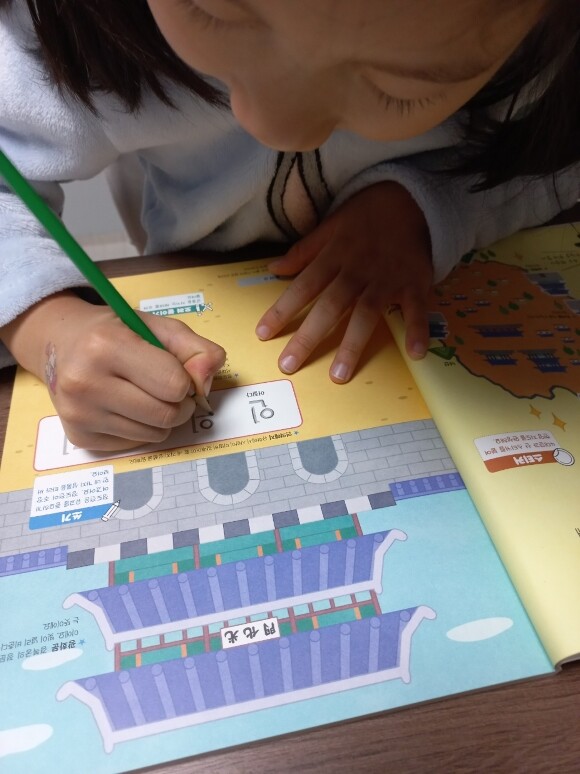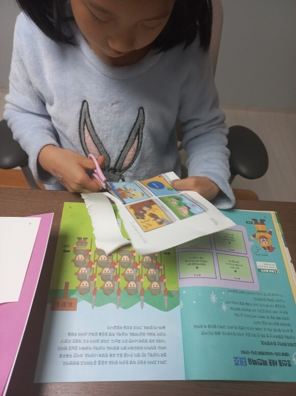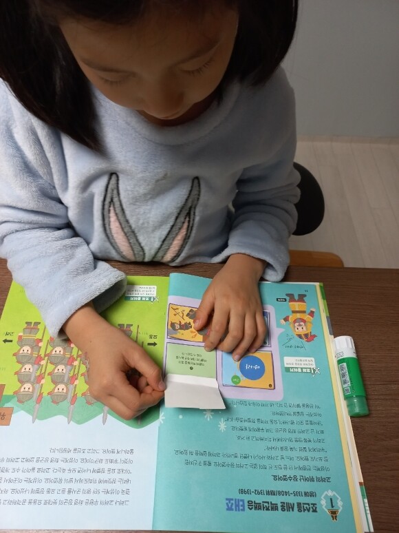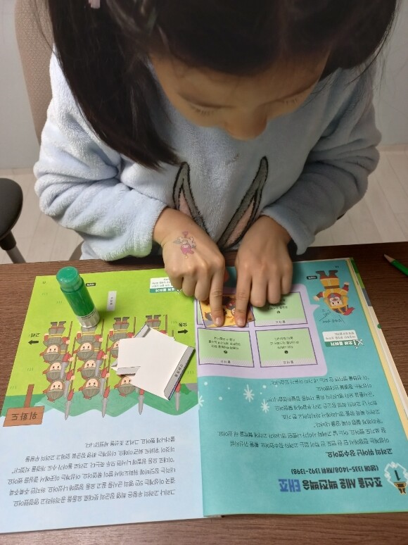 역시나 '종이를 오려서 붙이고, 스티커를 붙이고' 하면서 내 손으로 '한국사 플랩북'을 완성해 가는 재미에 푹빠진 꼬마아가씨의 아무진 손이 보이시나요?!!