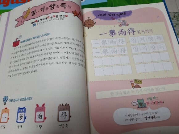 활용문장으로 "이 책을 읽으면 고사성어도 알 수 있고 국어 실력도 좋아지니 일거양득이야!"네요 ㅋ