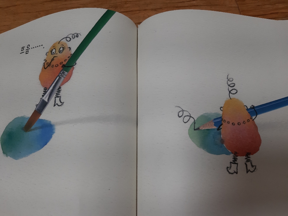 우리의 주인공 씩씩이는 초록과 파란색이 곁들어진 물감으로