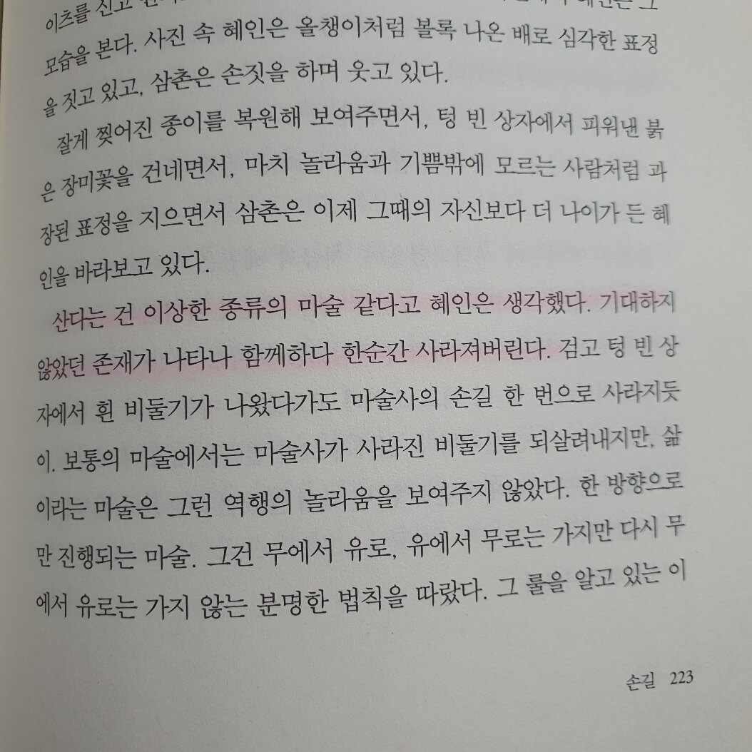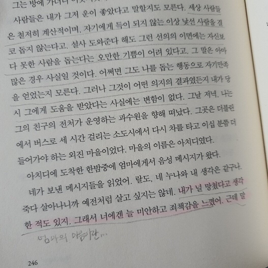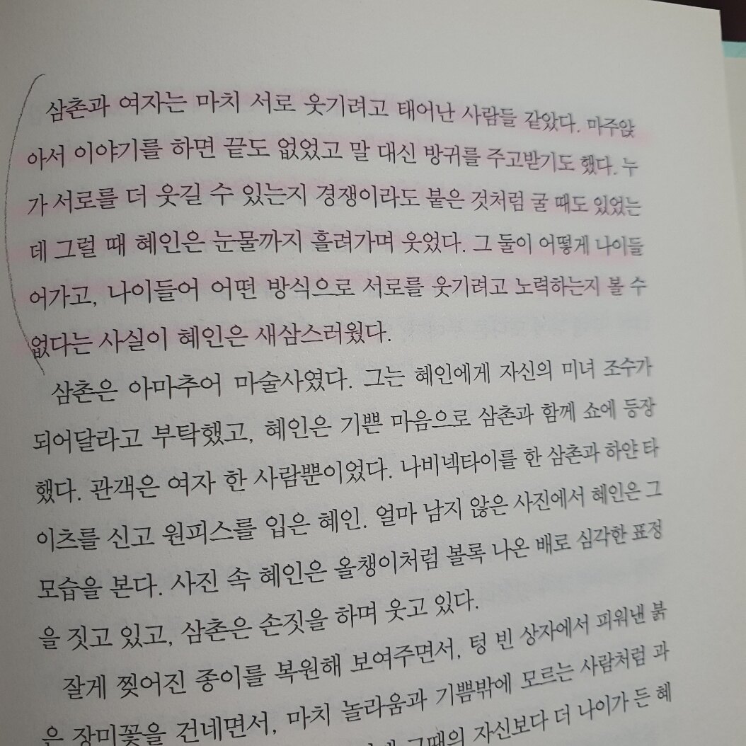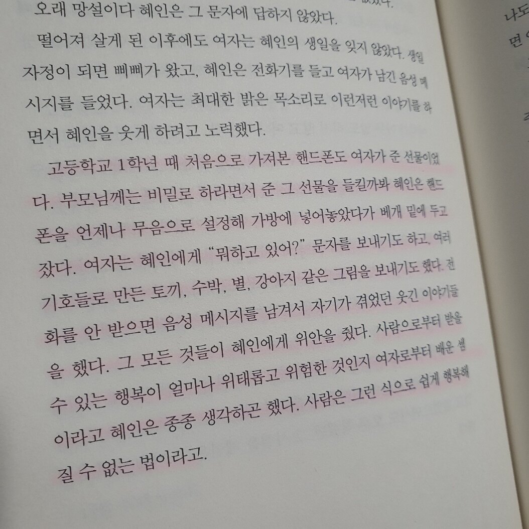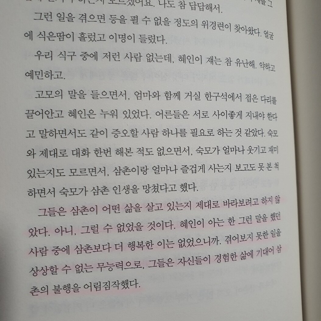 2018년에 처음 읽을 때는 이야기가 잔잔하다고 생각됐는데, 지금 읽으니 생각이나 감정에 대한 묘사가 정말 섬세하다. 어렸을 적 상처가 클 텐데, 어른이 되면서 그들을 이해하고 상처를 치유해가는 과정이 인간적이기도 하고. 대단하다!