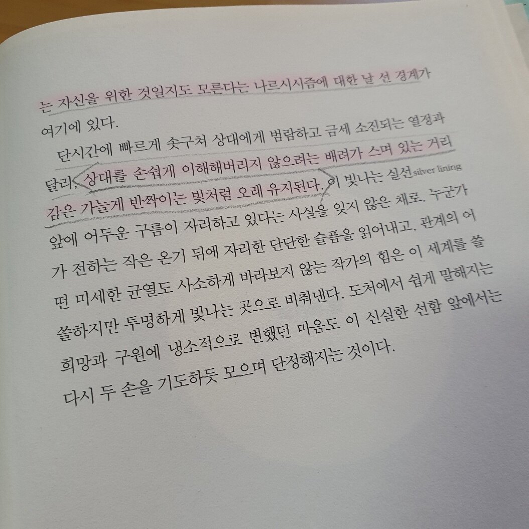 최은영 작가는 ‘쉽게‘ 이해하고 말하는 것을 늘 경계한다.내가 의도치 않았더라도 사람을, 아니면 다른 존재를 해치고 있지는 않은가 늘 의식하며 살아가는 사람은, 해를 끼치게 될지언정 원하는 방향으로 조금씩 나아갈 수 있다.