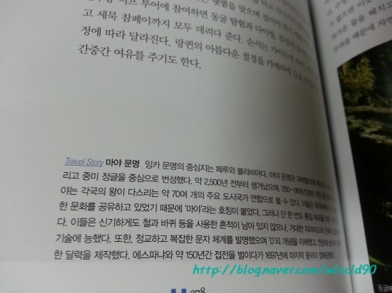 그외에도 Travel Story를 삽입해서 각 나라의 문명 이야기라거나 역사들을 알려주고있어서 흥미롭게 읽었다. 마야문명이라거나 멕시코 혁명에대해 나와있는 설명을 읽다보면  간간히 세계사시간에 배웠던 것도 있었지만 대부분은 모르는 것 투성이었다. 아무래도 서양역사라하면 주로 유럽중심역사를 배우다보니 상대적으로 남미에대해서는 간단한 역사적 상식도 모르는 무지한 상태였다는 것을 알게된다. ㅜㅠ 그래도 모르고 있었을 때에 비해 알고나서 지도를 보니 남미의 여러나라들이 그전과  다르게보이는 독특한 경험을 했다. 책을 덮고다니 자칭 중남미를 가장 잘 아는 사진가라고 했던 저자의 말을 인정하는 동시에 작가가 얼마나 꼼꼼하게 책을 준비했는지 알수있었다.