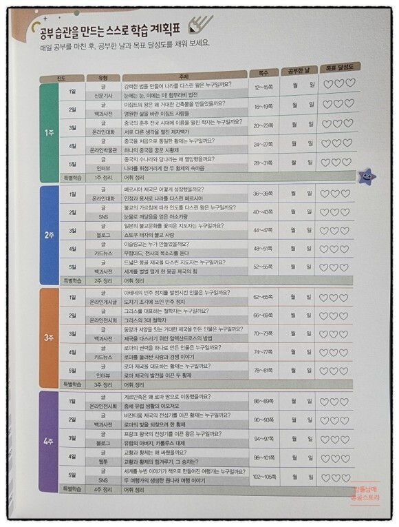 공부습관을 만드는 학습 계획표도 마련되어 있으니 아이 스스로 체크해가며 목표 달성도를 채워보면 좋겠네요.