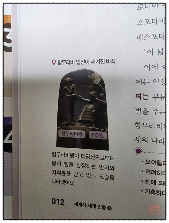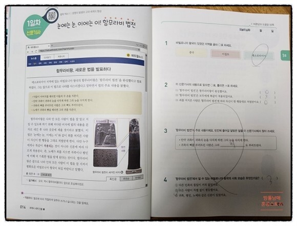 1일차는 기원전 18세기경 함무라비왕 시대의 세계사를 중학 역사 1의 교과 지문과 그와 연계된 신문기사 버전의 디지털독해문을 함께 학습하게 됩니다.