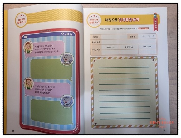 재잘재잘 채팅하며 글쓰기는 가장 높은 난이도의 활동으로 채팅 속 상대방이 던지는 질문에 답변해 보고 긴 독후감 쓰기를 도전합니다.