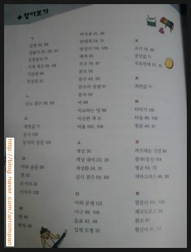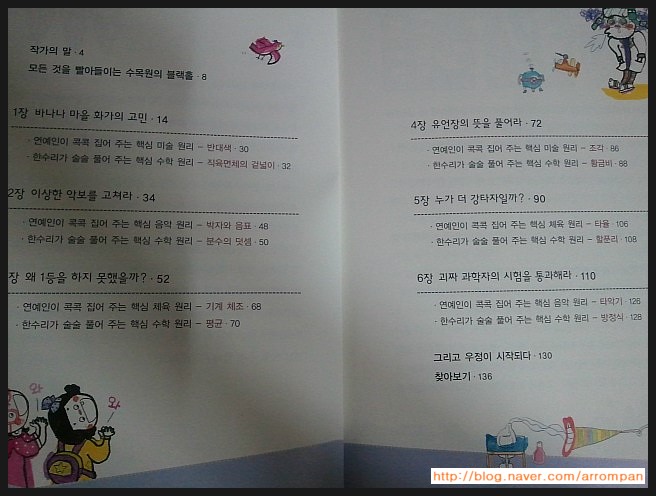 목차에는 아이들이 문제를 해결할 때 쓰인 수학과 음/미/체의 기본 개념들을 보여주고 있어요...