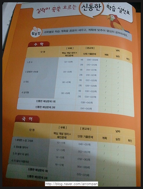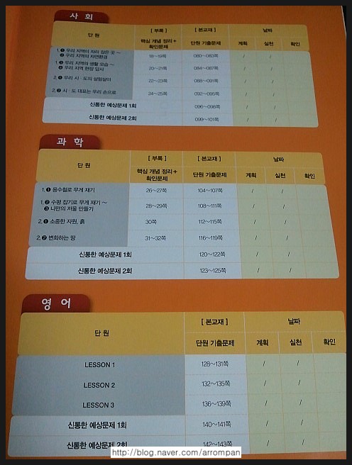 다음 페이지에는 각 과목마다 1회 풀 양을 정해주고 계획과 실천을 날짜로 표시함으로써~