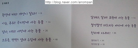 차례를 보면 환경을 구분하여 동물들의 사는 모습과 변하게 된 까닭.. 환경적응이