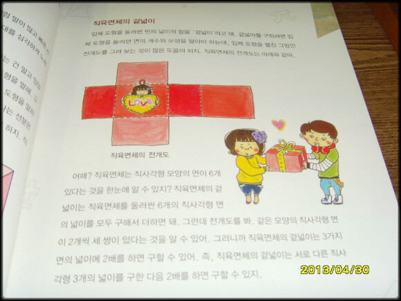 이를테면 입체 도형을 설명할때 아이들이 흔히 알고 있는 첨성대나 이집트의 피리마드를 예를 든다거나 해서 보다 쉽게 아이들의 이해를 돕도록 하고는 있는데 익숙치 않은 방법이기에 약간의 혼란은 예상 된다.