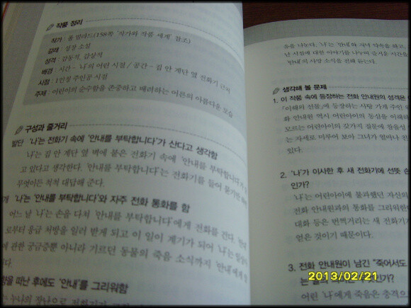 이렇게 작품에 들어가기전 그 작품에 대한 설명과 작가에 대한 설명 그리고 책의 구성에다 생각해볼 문제를 따로 만들어서 마치 국어 참고서를 보는듯한 느낌이었는데 가만 생각해보니 요즘 아이들은 책하나를 읽어도 입시에서 자유롭지않은것을 깨닫게 하는 부분이다.