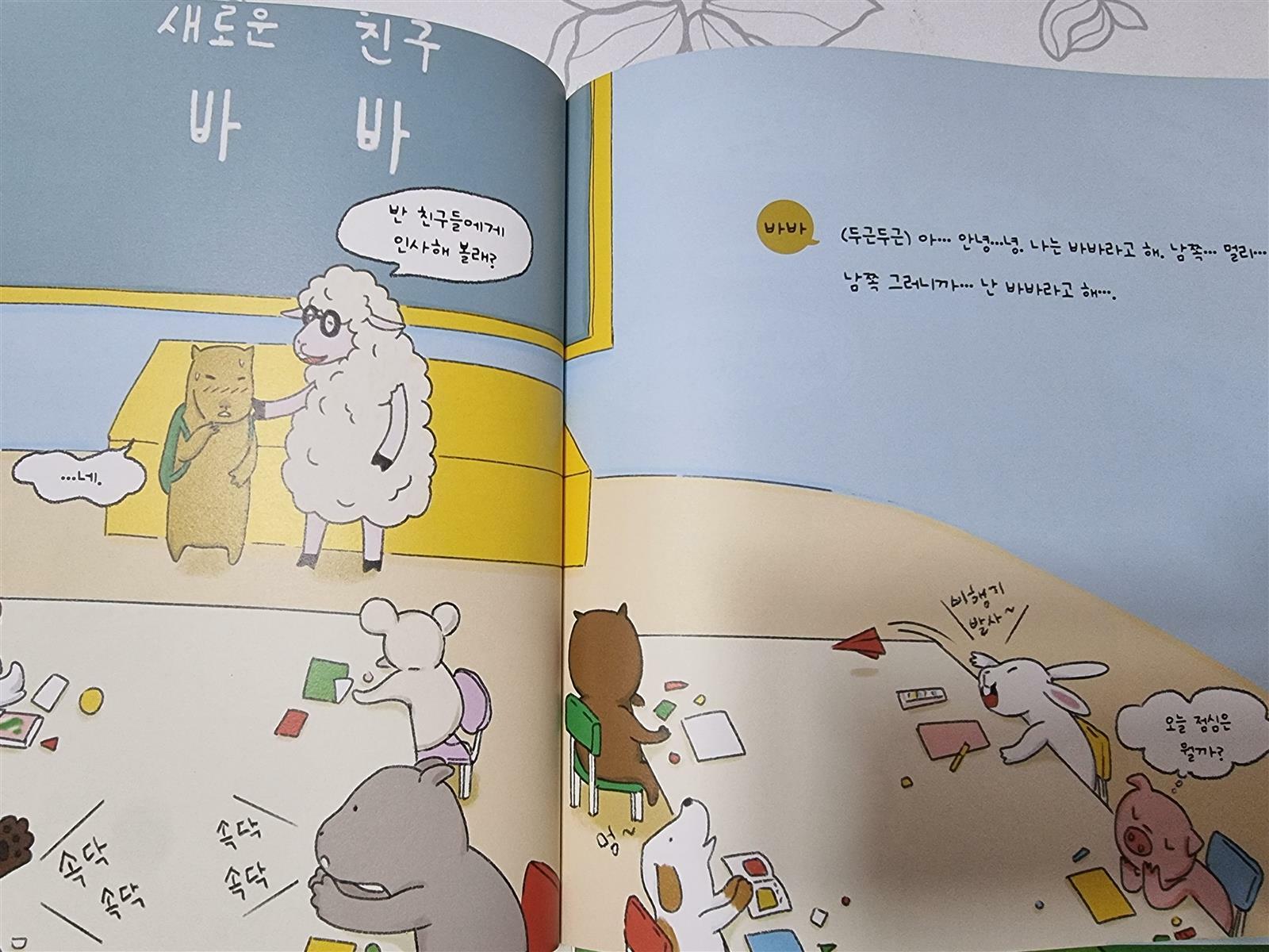 새로운 환경에 적응하는 일은 어른도 매우 어려운 일이에요. 어른에게도 이사 이직은 굉장한 스트레스가 되는데, 아이들은 아마 이사, 전학 스트레스가 더 심하지 않을까 싶어요. 저희 가정도 이사를 고민하고 있는 시점이라서 이 책이 더 마음에 콕 와닿았어요. 낯선 환경에서 적응해 나가는 바바 모습에서 저와 제 아이 모습이 보였어요. 저도 낯선 곳보다는 익숙한 곳을 좋아하는 편이고 그래서인지 첫째가 유독 낯선 환경을 싫어하고 앓이를 하는 편이에요. 지금은 어느 정도 커서 좀 나아지긴 했지만 좀 더 어렸을 때는 엄청 심하게 새학기앓기도 했어요. 이사가 아님에도 그런 아이라 정말 낯선 환경으로의 이사는 매우 조심스럽답니다. 새로운 친구가 이사오자 난생 처음 보는 모습에 마을이 들썩들썩해요! 먼 남쪽 나라에서 온 이 친구가 정말 궁금하지만 새로 이사온 이 친구는 모든 게 낯설고 쑥스럽기만 해요. 바바는 과연 적응을 잘 마치고 숲속 마을 친구들과 친해질 수 있을까요? 말풍선과 예쁜 그림들이 있는 그림책이라서 아이들이 굉장히 좋아했어요. 연극하듯 아이들끼리 읽는 재미도 쏠쏠했답니다. 막내까지도 이제 한글을 읽으니까 이럴 땐 셋이서 정말 알콩달콩 한 것 같아요. 쫑알쫑알 시끄럽긴 하지만 웃음이 끊이질 않는 즐거운 시간이에요. 우리는 더불어 살아가야 하는 것임을 말해주는 그림책 같아요. 처음 본 사람, 낯선 사람을 받아들이는 것이 쉽지는 않지만 특히 나와 모습이 다르다면 더더욱 쉽지는 않겠지만, 그럼에도 불구하고 외면하고 따돌리는 모습보다는 먼저 받아들이고 적응할 수 있도록 도와주는 마음이 필요하다는 것을요. 쑥스러움에 주눅 들어 있는 바바에게 토순이가 먼저 관심을 가지고 말을 걸어줌으로 인해서 제목에서부터 느껴졌던 거부하는 마음은 온데간데 없고 누군지 알고 있다는 호기심으로 바뀌었어요. 서로서로 누군지 알아가고, 가까워지는 시간이 필요한데 그 시간들을 채우고 나서 다양한 친구를 사귄다면 세상을 보는 눈은 더 커질 거에요^^ 우리 아이들이 토순이처럼 따뜻한 사람으로 커갔으면 하는 생각이 들었어요. 용기있고 따뜻한 마음을 가진 사람으로 성장할 수 있도록 제가 더 노력해야겠지요?ㅎ 따뜻하고 좋은 그림책 읽게 해주셔서 감사합니다. 이 글은 책세상 맘수다카페를 통해 출판사에서 도서를 무상으로 제공받아 읽고 솔직하게 작성한 후기입니다.