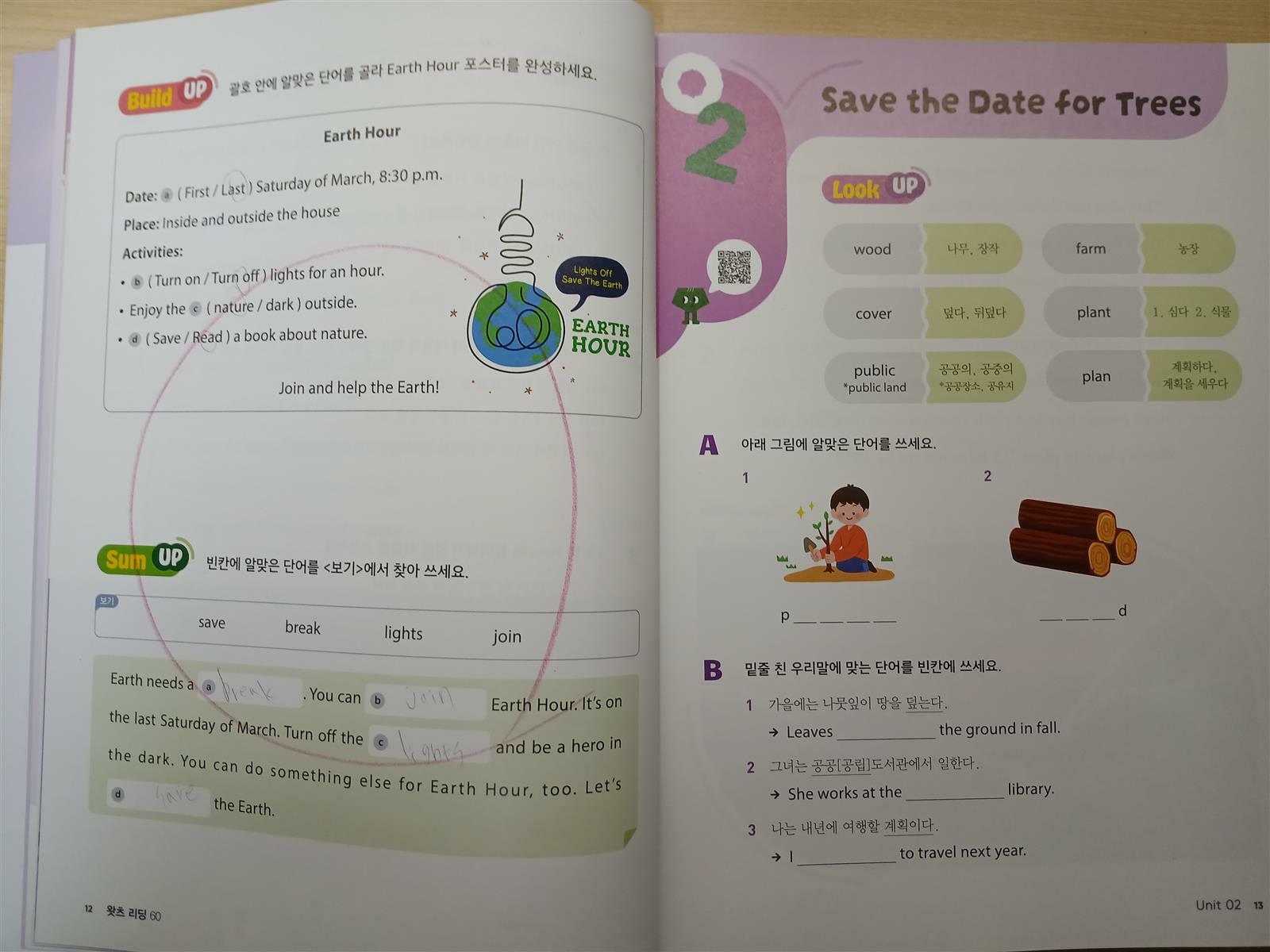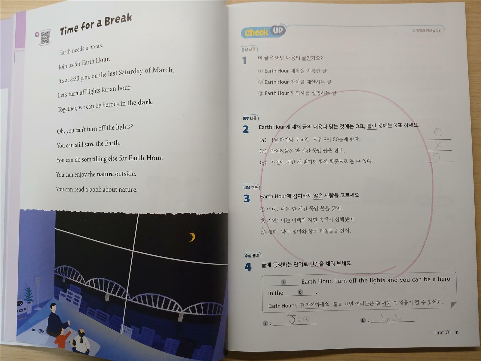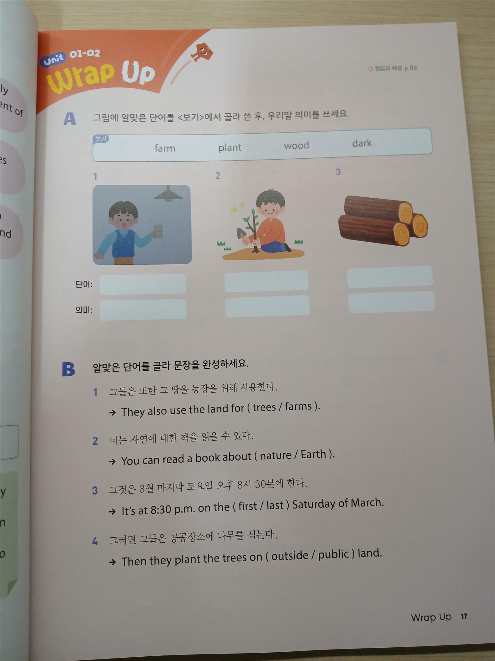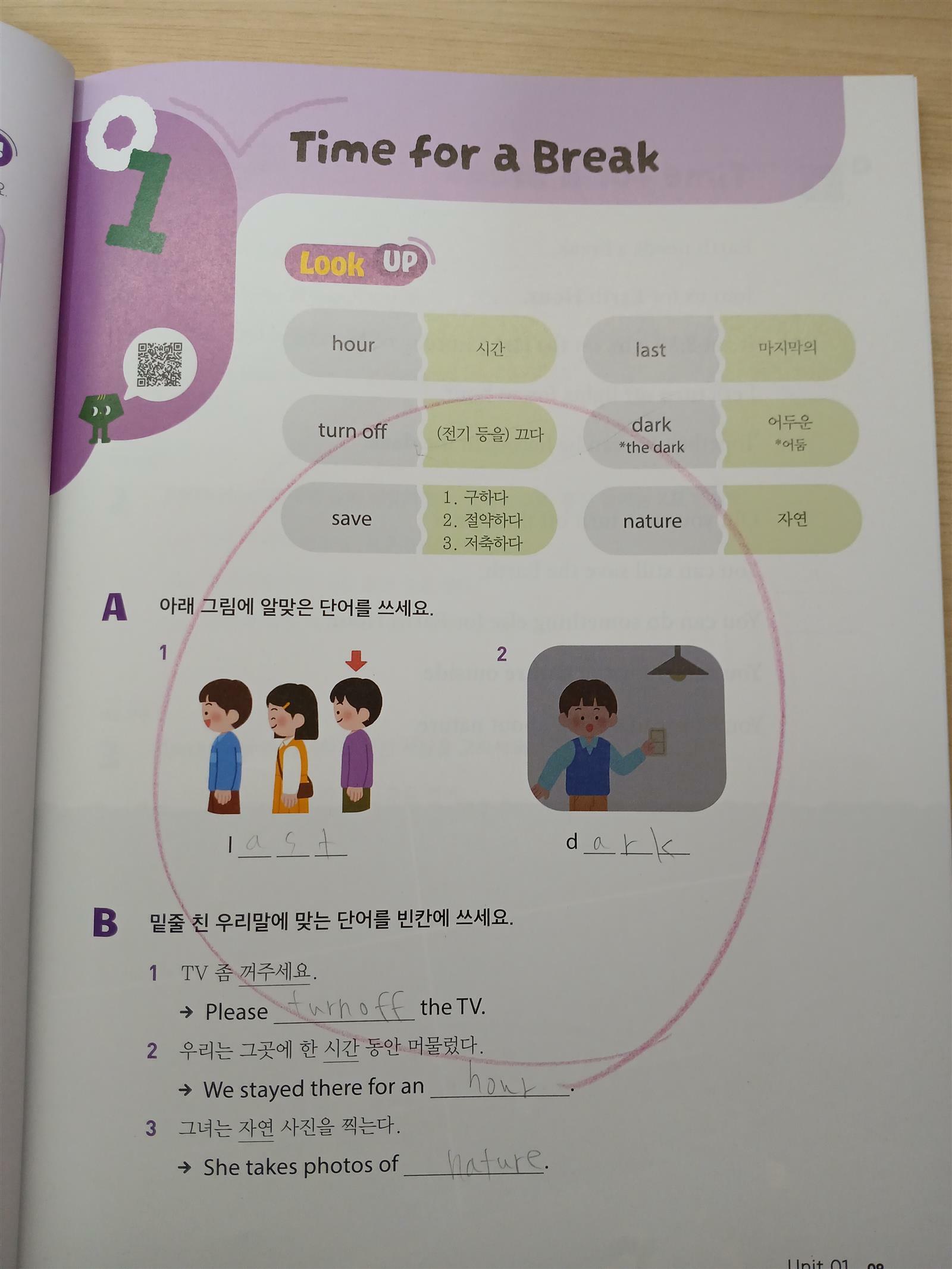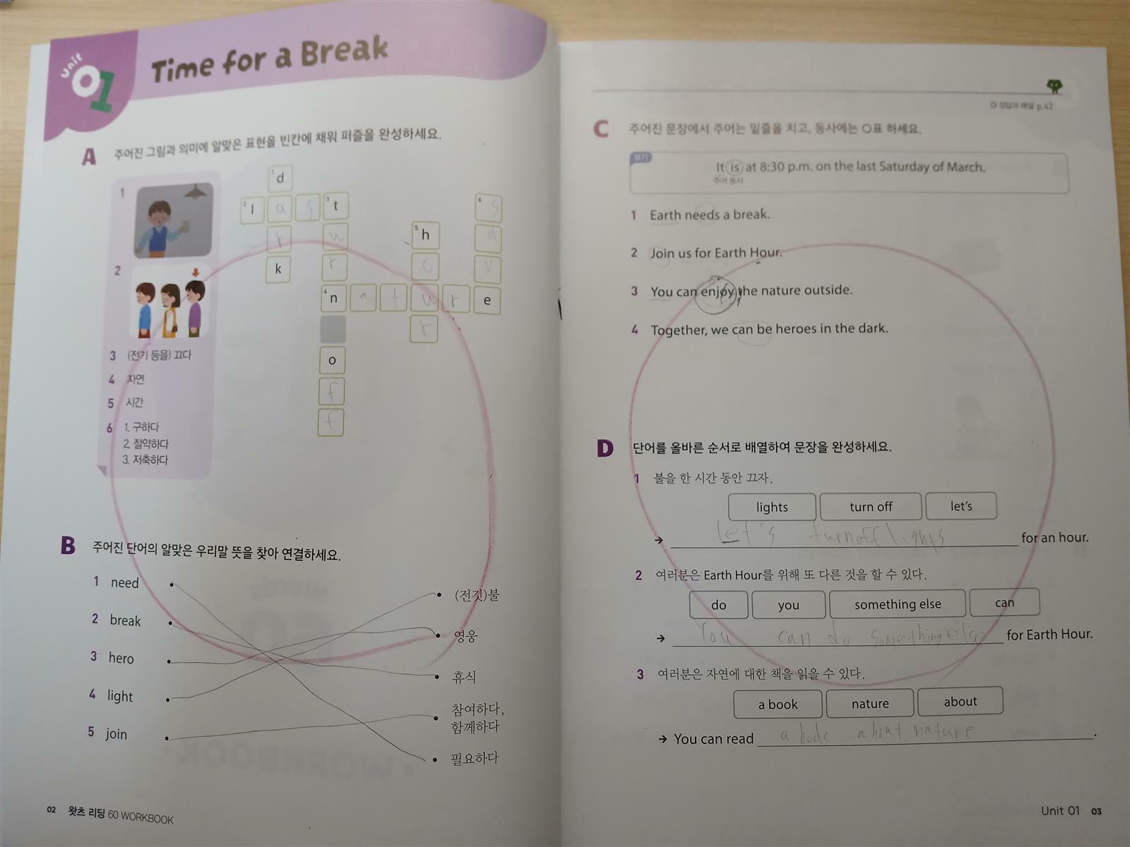 유닛1이 끝나서 워크북을 펼쳐 학습했어요.
