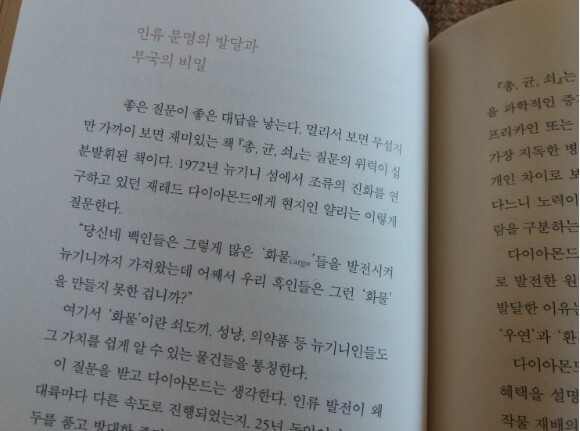 700쪽이 넘는 두께의 책으로 지리학, 식물학, 동물학, 고고학, 역사학 들을 통해 방대한 자료들을 활용하고 통합하여 대륙 간 불평등의 원인을 탐구한 내용인데 인류의 문명을 꿰뚫은 책이자 가설과 검증으로 밝혀낸 문명생성 보고서라니 흥미롭다.