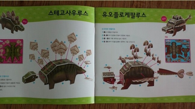 번호 순서대로 따라하기 쉽게 설명된 전개도와 완성되었을때의 공룡모습이 나와 있어
