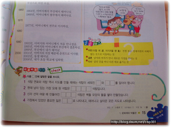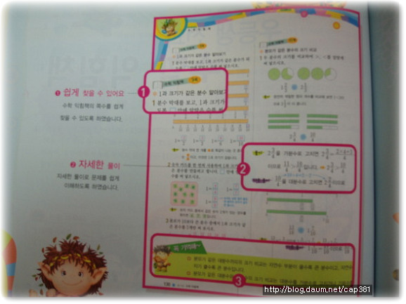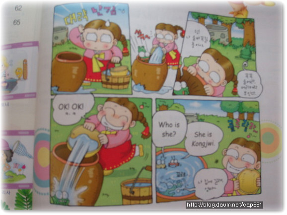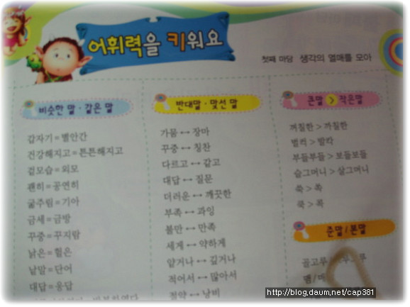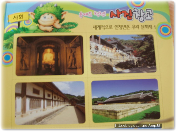 아이와 함께 우등생 전과를 여기저기 둘러보며 내용을 확인하게 되니.. 과목마다 특징을 살려 다채로운 구성이 먼저 이목을 끌더라구요. 특히 사회과목 내용즁 우리 중요 문화재들을 낱장으로 뜯어보며 앞장에 그림이 뒷장에 관련내용이 간단히 적혀 있는걸 보며 카드놀이도 하고 유익한 학습자료로 사용할 수 있었거든요. 아이들 눈높이에 맞춰 학습 호기심을 불러 일으키기에 이보다 다채로운 전과가 또 어딨을까 하는 생각이 쓰나미처럼 몰려오더군요 예체능과목에서는 음악 CD도 첨부되어 있고.. 관련 영어문장을 이렇게 깜찍하면서도 엉뚱한 캐릭터로 분한 콩쥐가 재밌는 상황을 연출하기도 한답니다. 특히 수학은 이처럼 수학 익힘문제를 꼭꼭 짚어주고, 이어 자세한 풀이를 통해 여러 문제를 통해 문제의 핵심을 파악하게 해주어서 좋구요. 국어는 중간꼭지에 어휘력을 키우는 페이지가 꼬박꼬박 들어있어, 나중에는 우리말 겨루기 퀴즈쇼에 나가도 될만큼의 어휘수준이 될 것 같더라구요. 정말 이처럼 익사이팅하고 엣지있는 천재교육 우등생 전과.. olleh 아닌가요?