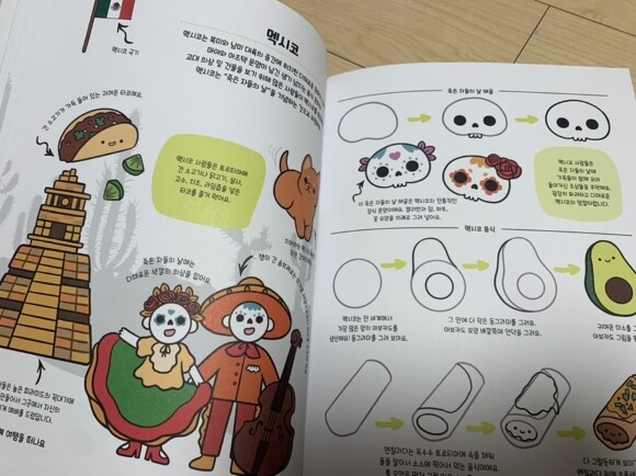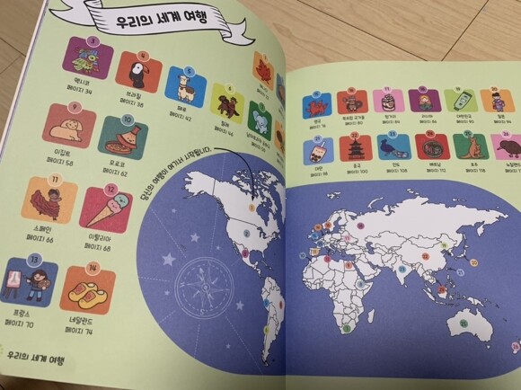 이번에 만나본 책은 “세계편”으로 세계의 다양한 나라를 테마로 깜찍한 그림들을 그려보며 문화에 대해서도 배울 수 있는 일석이조의 매력이 있는 책이었답니다.