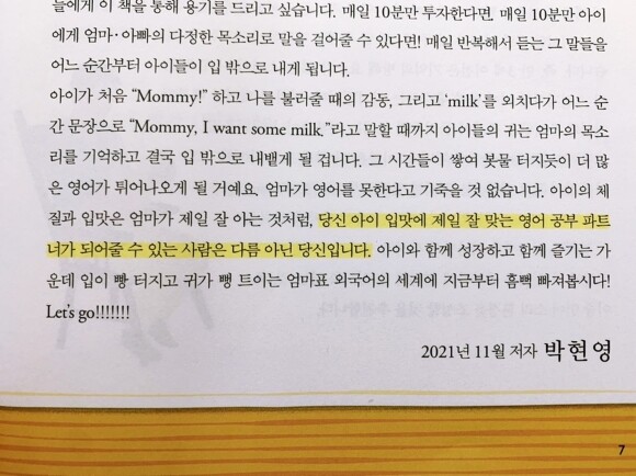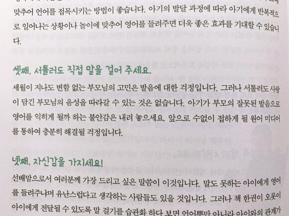설령 발음에 자신없는 부모님이 계시더라도 자신감을 갖고 아이에게 영어 말 걸기를 습관화해보 조언해주십니다.