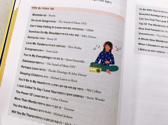 저희 아이는 이제 4돌이 다 되어가지만, 저희 아이와 함께 나눌 수 있는 표현들이 많을 뿐 아니라 이렇게 추천 팝송까지 나와있어서 아이와 함께 들어보았어요.