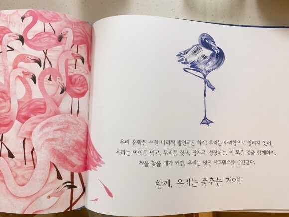 즐거운 모임도 있습니다. 함께 춤을 추는 홍학 무리. 그 화려함이 그림책을 뚫고 나오는 것 같습니다.