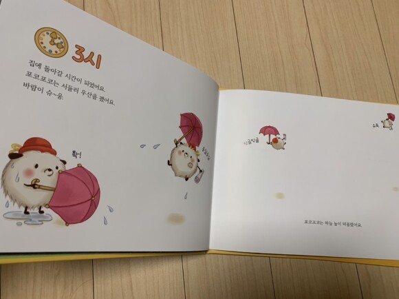 이 책은 간단하게 시간개념도 알려줄 수 있는 책이에요. 오전 10시부터 3시까지 여기저기 나들이를 나서는 포코포코. 올빼미네 시계 가게엔 무슨 일일까요?