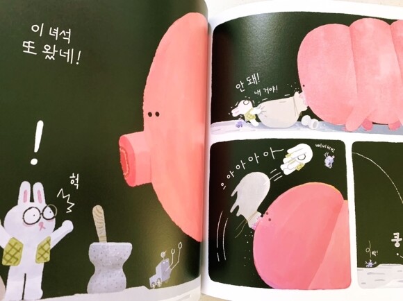 그리고 이 책의 큰 매력은 바로 다양한 의성어 의태어들이에요. 콩콩콩 퍽퍽 으쌰으쌰 파파파파파팍 슈슝! 그 다이내믹한 느낌을 잘 살려 읽어주는 것이 포인트 입니다.