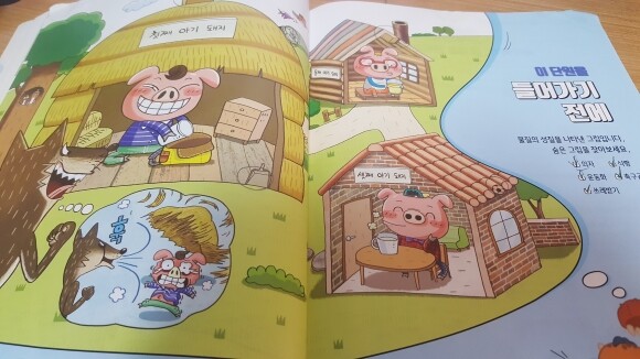 숨은 그림을 찾으면서 돼지삼형제들의 집이 어떤 물질로 이루어졌는지도