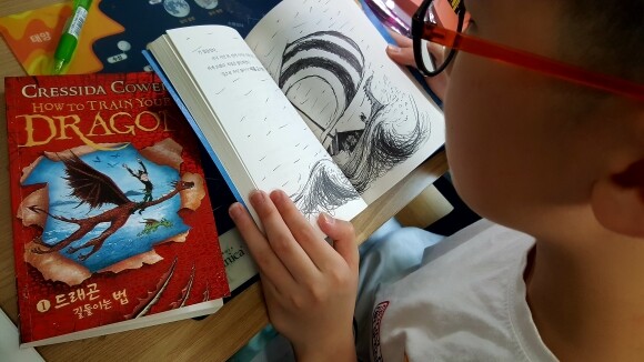 책상에서 또 <드래곤 길들이기> 1,2편을 모두 읽고 있는 린이에요.