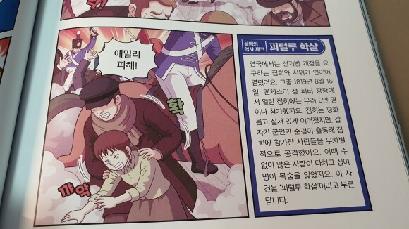 '피털루 학살'에 대해 자세히 설명해 주고 있어요.
