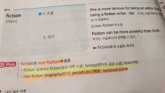 fiction : science fiction(공상 과학 소설), fantasy(판타지, 공상 소설), fable(우화)