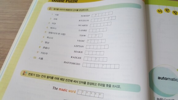 한 주 동안 익힌 어휘 중 10개의 단어 철자를 우리말과 일치하도록 배열한 후