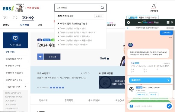 EBSi에서 검색창에 번호를 입력했더니 바로 '퓨리봇' 창이 떠