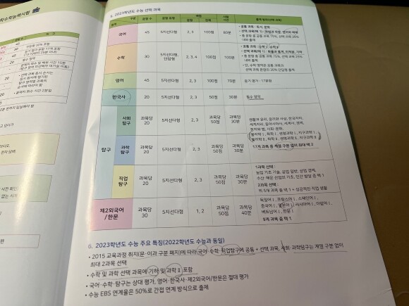 수능 시간표와 수능 선택 과목에 대한 설명도 나와있어서