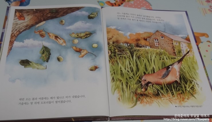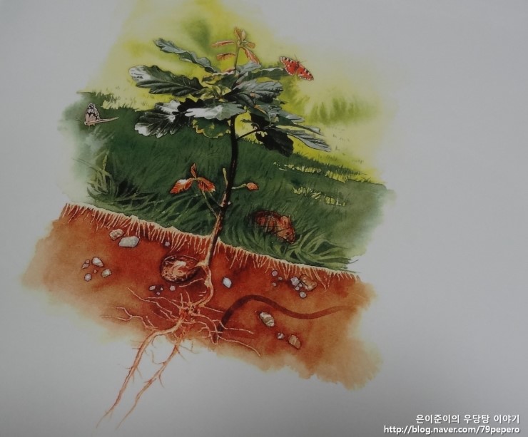 그러나 풀 속에 숨어 있던 도토리의 새싹은 작은 나무로 자라고 있었습니다.