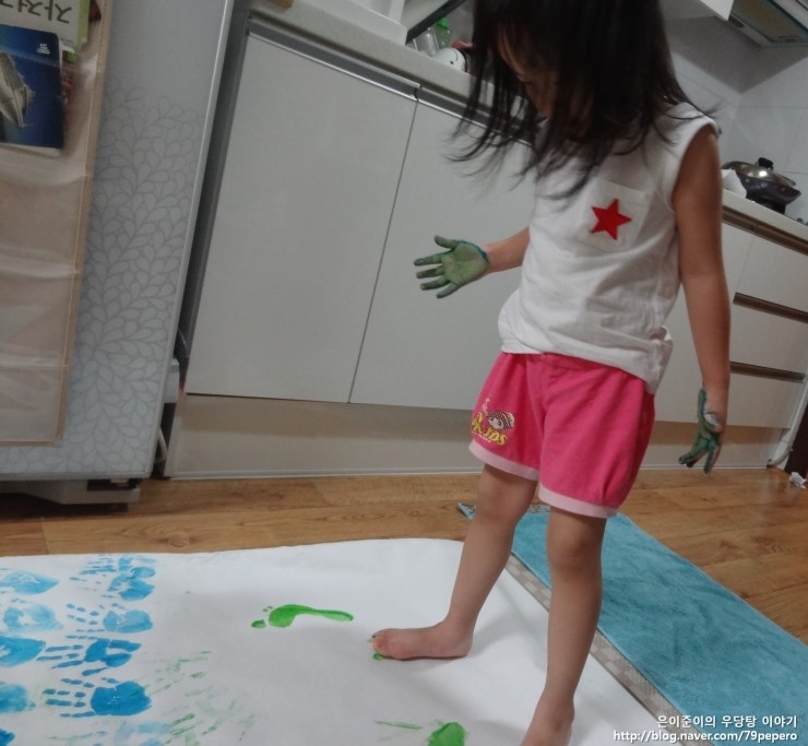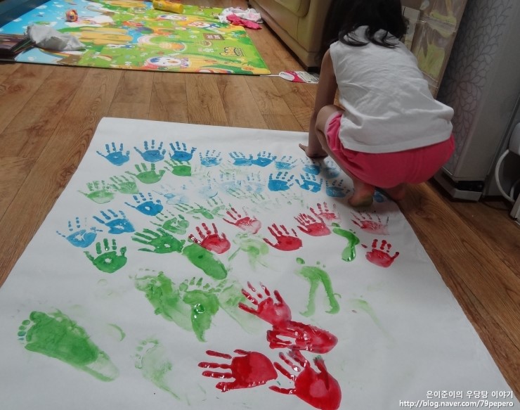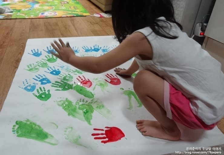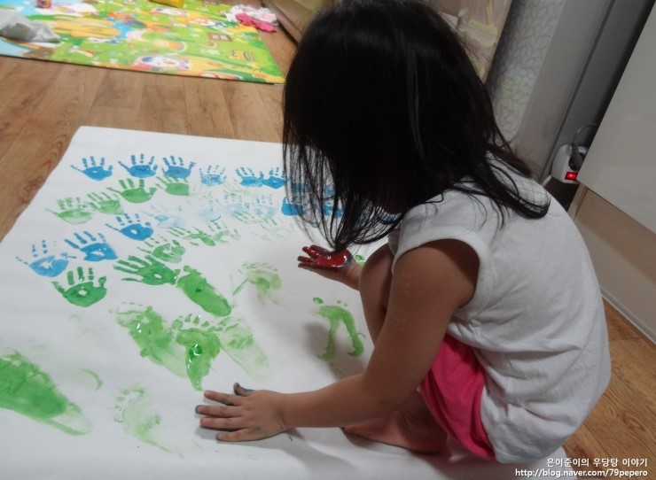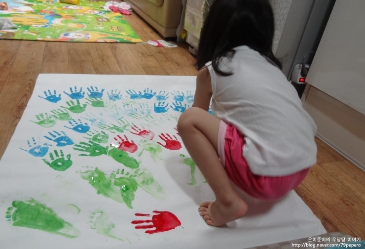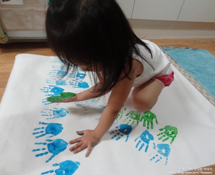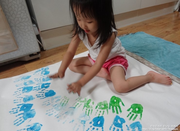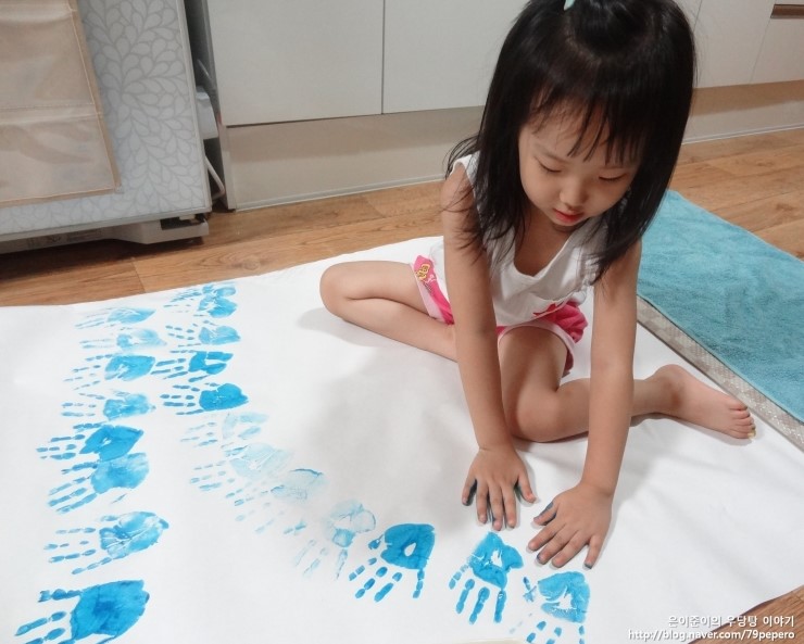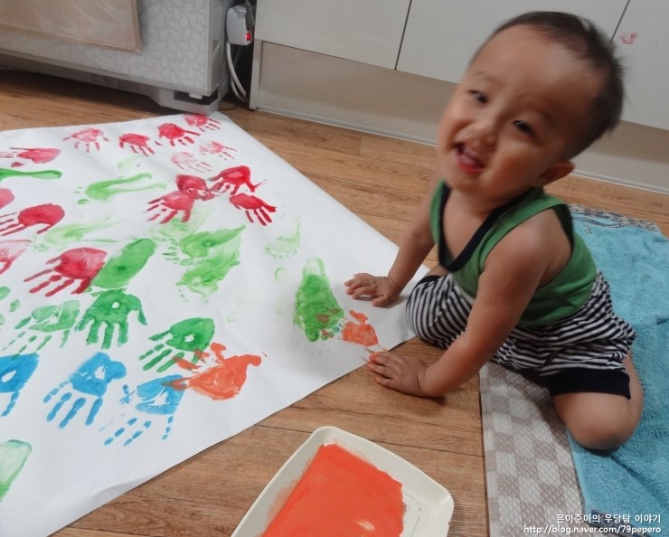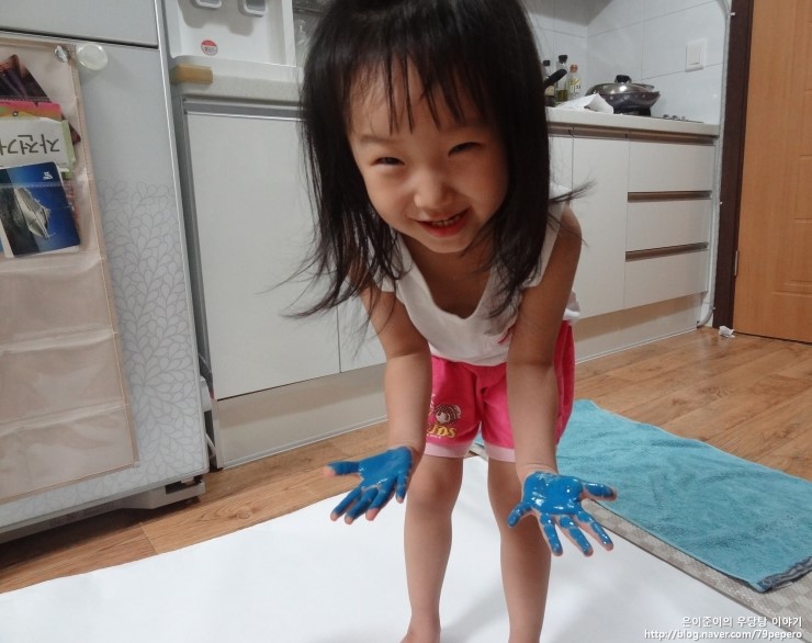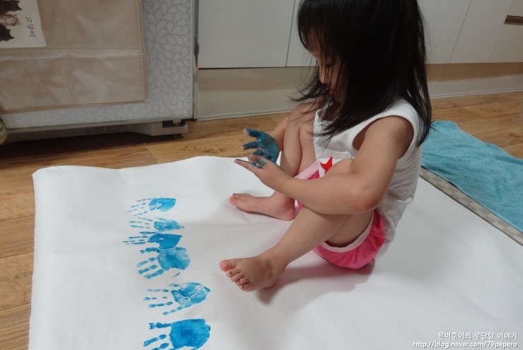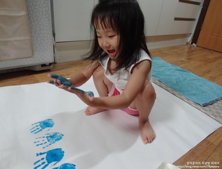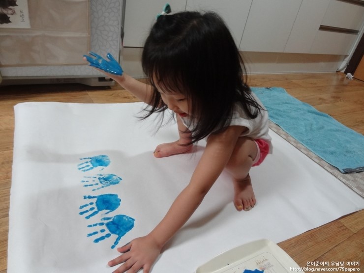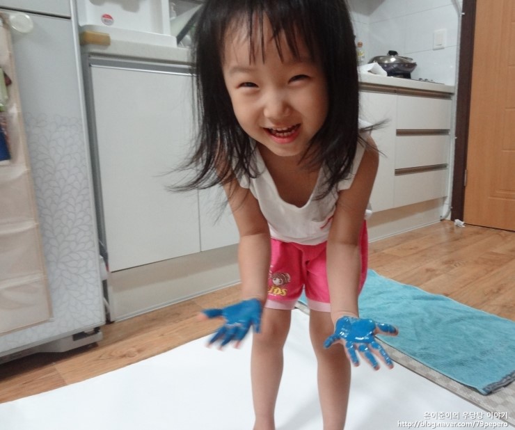 파랑 손 도장을 꾹꾹~ 아주 신이 난 얼굴이에요.