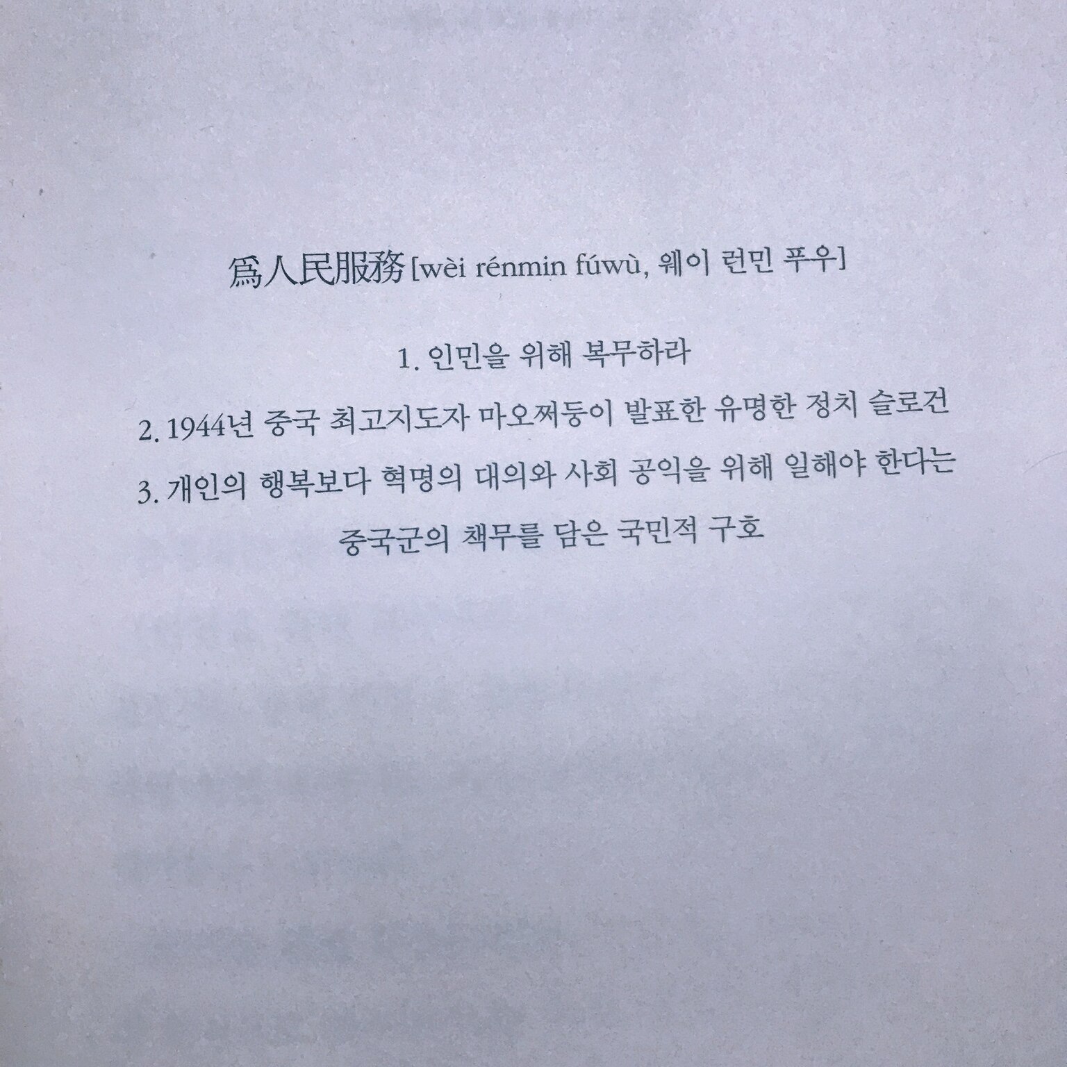为人民服务, 마오쩌둥의 정치 슬로건이자 연설 중 한 말로 유명한 구절입니다. 나의 이익보단 국가 전체, 즉 인민 전체의 이익을 위해 일하라는 의미인데 이 책 속에서는 오히려 마오주석의 뜻에 반하는 행위의 원동력처럼 사용된 말이라 굉장히 위험하다는 생각이 들면서도 재밌었습니다. 한 때는 이 말이 적힌 팻말을 떨어뜨리기만 해도 감옥에 갇히곤 했는데, 오히려 그 옛 상황을 꼬집는 것처럼 ‘인민을 위해 복무하라’라는 말을 반동의 원동력으로 사용하는 것에서 작가가 가지고 있는 중국 사회에 대한 생각이 잘 드러났다고 생각합니다.