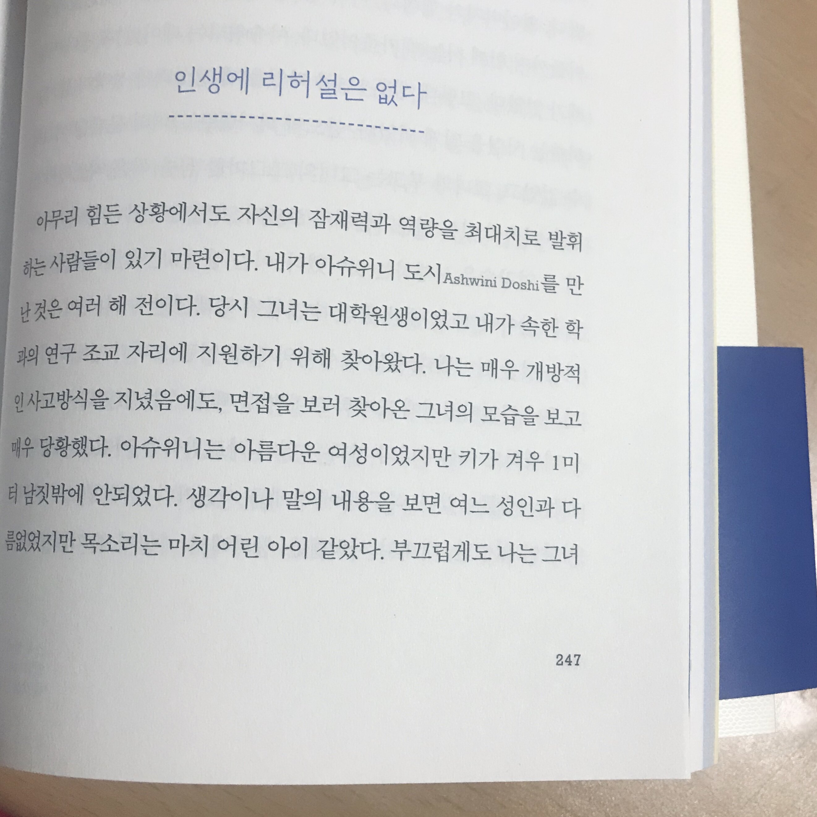 저자는 후반부 한 소제목으로 ‘인생에 리허설은 없다’라는 문장을 택했다. ‘리허설이 없으니 한 번에 잘 살아야 한다는 소리인가? 처음인데?’라는 생각에 내용을 읽기 전까진 다소 불만스러운 소제목이었다. 하지만 실제 내용은 나의 불만과 정반대였다. 리허설이 없는 인생이기에, 실패나 좌절도 결국은 하나의 길이고, 하나의 무대로 갈 수 있는 걸음일 뿐이니 꾸준히 살아가라는 일종의 위로였다.