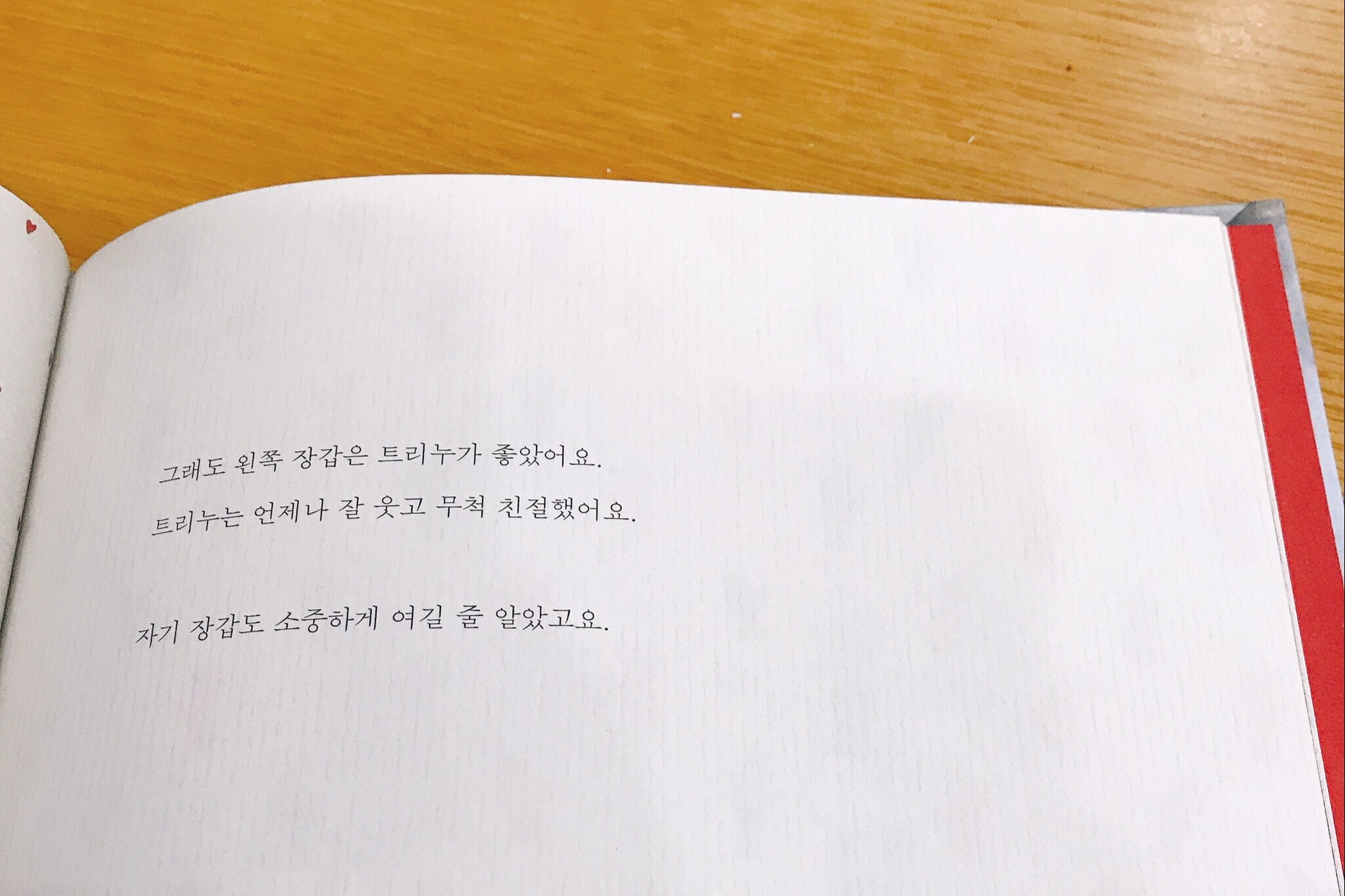 짝을 이룰 때만 쓸모있어지는, 즉 함께 할 때 계속 살아갈 수 있는 장갑의 모습은 우리 삶을 연상시킵니다. 사람들이 모여 이야기를 나누던 중 상처를 받기도 하지만, 결국 서로의 마음을 녹이고 치유해주는 것도 사람입니다. 받침을 하나 바꾸면 사랑이 되기도 합니다. 최근 개인주의가 만연해지며 ‘더불어’ 살아가는 사회라는 말이 아직도 유효한지는 잘 모르겠네요. 하지만 이 책을 읽는 아이들과 어른들의 추억을 잘 들여다보면 트리누의 주머니 속 혼자 남은 장갑처럼 누군가를 찾기 위해 자신을 희생하고 싶을 정도의 기억 한 번쯤은 있지 않을까요? 그 마음을 감히 사랑이라고 정의하고 싶네요.